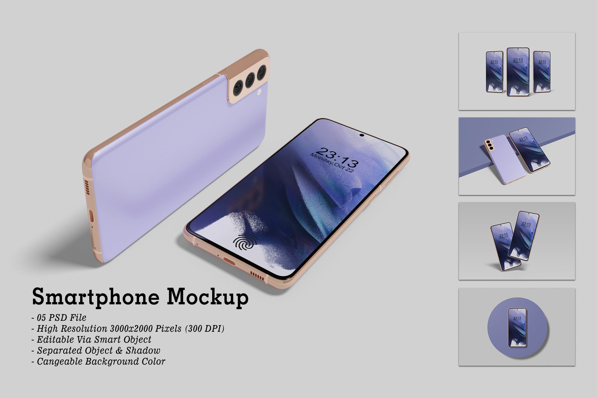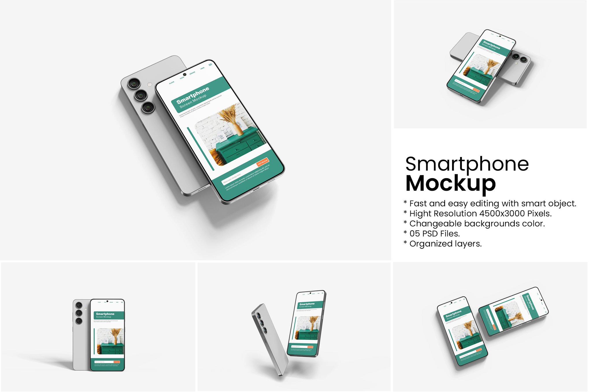 描述 这个项目包括05种不同风格的智能手机模型,用于以逼真的外观展示您的设计。这些模型文件使用了智能对象功能,可以帮助您在几秒钟内更改设计。 特征: 05个单独的PSD文件 高分辨率3000x2000像素,300dpi 通过智能对象进行定制 分离对象和阴影 仅适用于背景颜色 包含的文件: 5个PSD文件。 PDF指南 注意:此预览中使用的图像或设计不包括在内。- 3