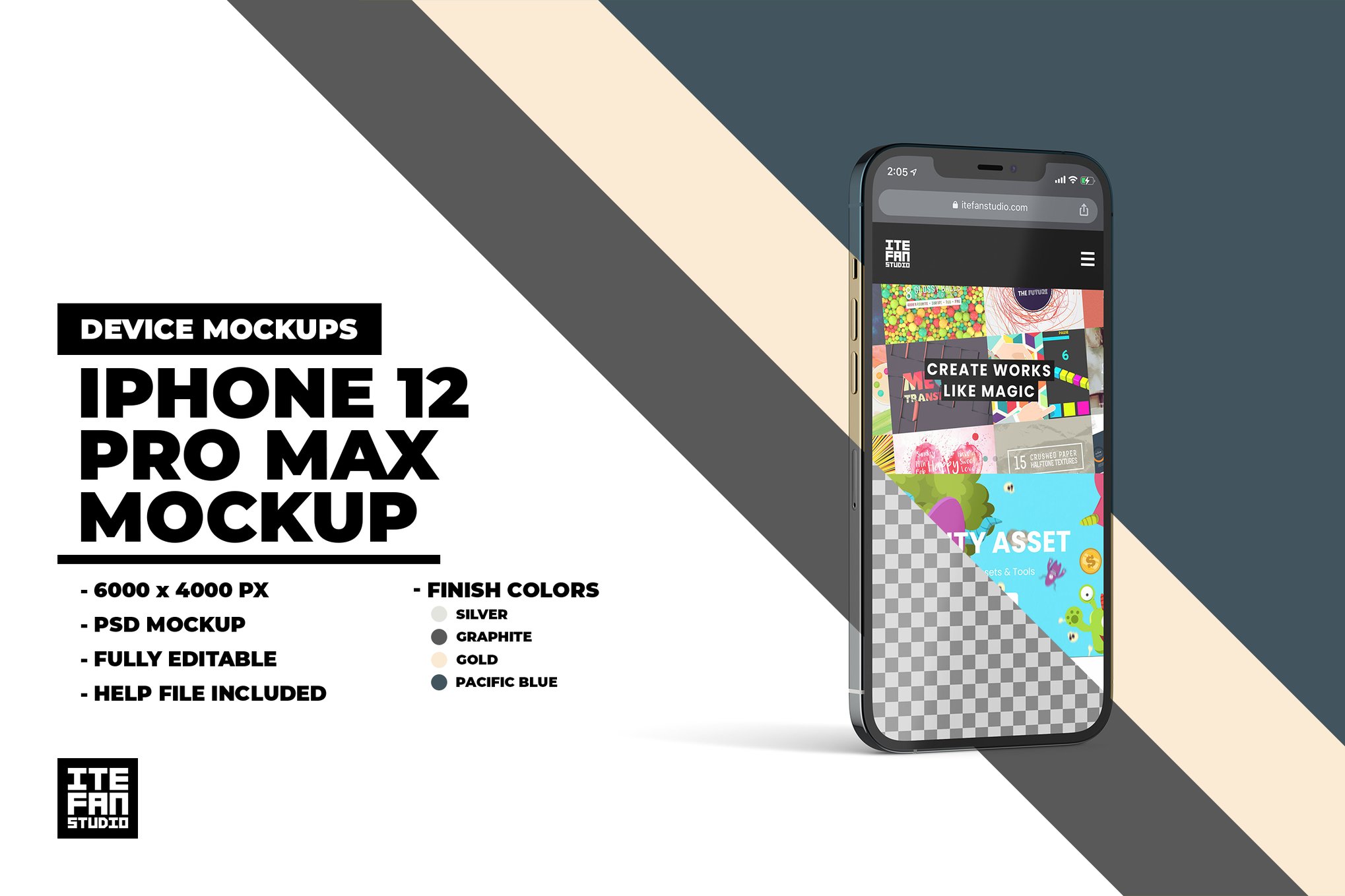 描述 使用这款iPhone 12 Pro Max模型来为您的项目创建一个逼真的模型图像。非常适合展示您的应用程序或网站设计等。 特征: 高分辨率:6000×4000像素 通过智能对象进行可编辑设计 分离的阴影 完全可编辑 易于使用:有序命名的图层 分层PSD文件 包含的文件: PSD文件。 PDF指南 注意:此预览中使用的图像或设计不包括在内。- 4